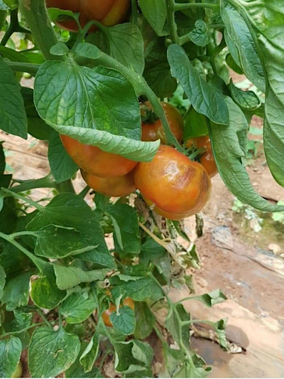 Οι καρποί εμφανίζουν κίτρινους ή καστανούς δακτυλίους, καστανές περιοχές και ρυτίδωση, όπως επίσης παραμορφώσεις και ανομοιόμορφη ωρίμανση. Οι καρποί της τομάτας είναι μη εμπορεύσιμοι και η μείωση της παραγωγής κυμαίνεται από 30 έως 70%.
